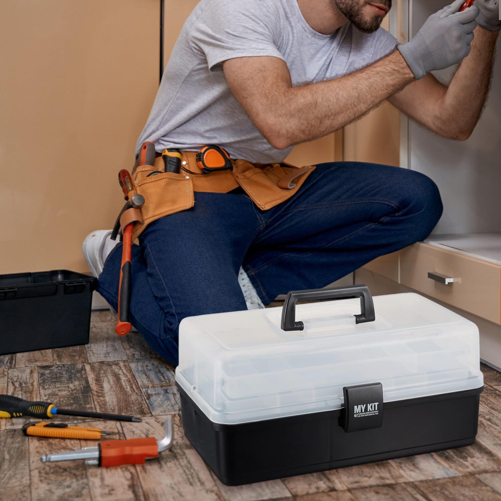 アイリスオーヤマ マイキット 幅37cm×奥行20cm×高さ18cm 工具収納 工具箱 ケース クリアブラック 万能ケース 収納ボックス ツールボックス DIY アウトドア キャンプ 小物入れ 2段式トレー | allstore1