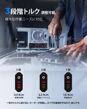 【新機能搭載・3段階トルク調整可能】一般的なモデルでは1段階のみの仕様が多い中、この小型電動ドライバーは最新設計を採用し、3段階トルクを搭載。用途に応じて最適な力加減で作業が可能です。「1段階」トルクは1.5N・mで、精密機器に最適。締め付けが軽く、ネジや素材を傷めにくい仕様。「2段階」トルクは2.2N・mで、コンセントの取り付けや小型家具の組み立てに最適。家庭用にバランスの取れたパワー。「3段階」トルクは3.3N・mで、本棚やテーブルなどの取り付けに対応。高トルクで力のいる作業も素早く完了。さらに、トルク調整機能付きで、設定値に達するとモーターが自動で空転し、ネジの締めすぎを防止します。