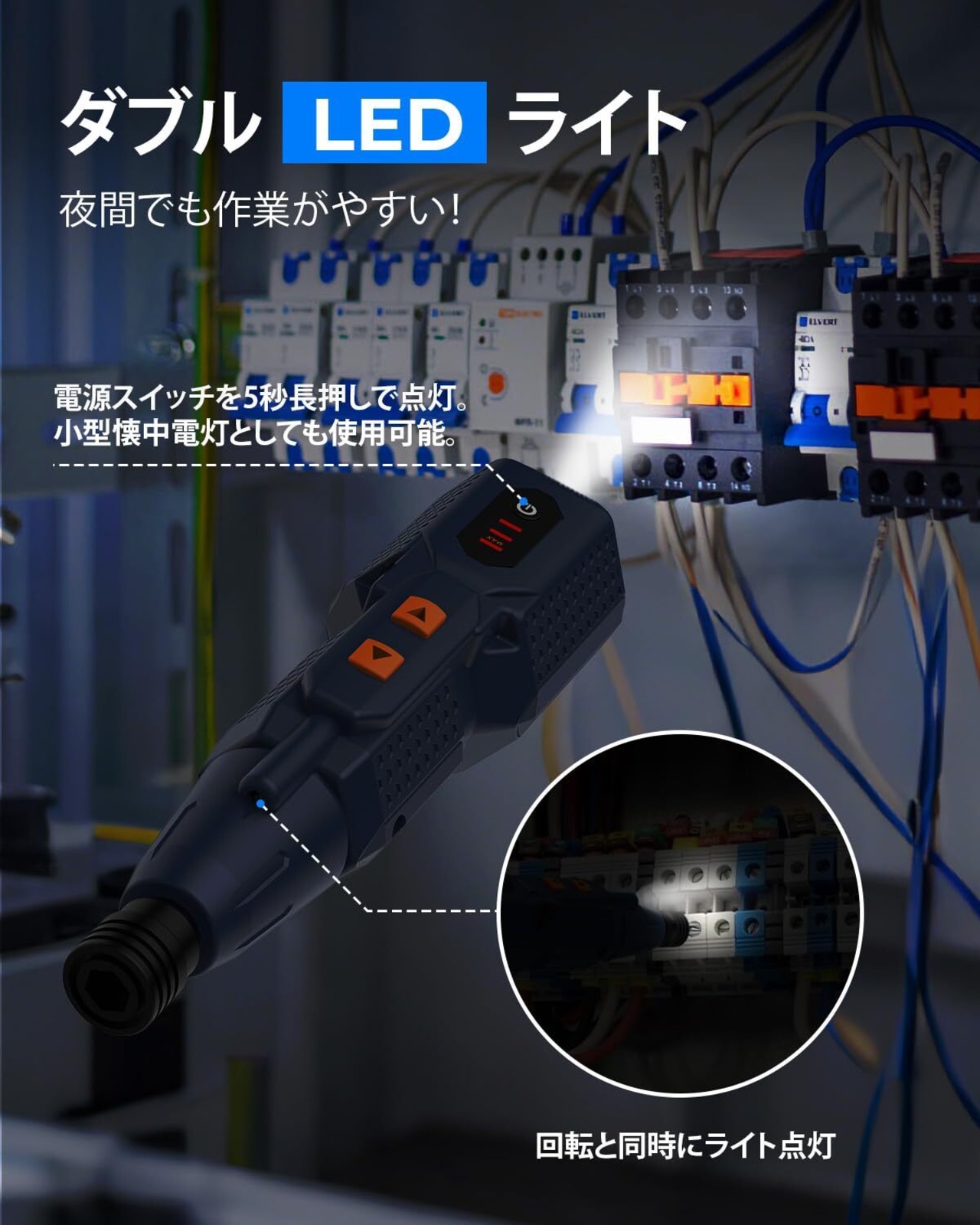 【ダブル高輝度LED搭載・多用途対応】この電動ドライバーは、先端と後部の両方に高輝度LEDライトを搭載しています。作業スイッチと連動して先端のLEDライトが自動点灯し、暗所や狭い場所での作業効率を大幅に向上。後部のLEDは独立した設計で、長押し(5秒)で点灯、もう一度押すと消灯できるため、作業時以外でも携帯ライトとして便利に使用可能です。コンパクトかつ軽量なボディで持ち運びが簡単。ボタンひとつで正回転・逆回転の切替ができ、コンピューター、スクリーン、ゲーム機、プロジェクター、家具の組立・修理、DIY作業まで幅広く対応。夜間や緊急時の作業も快適・安全にサポートします。