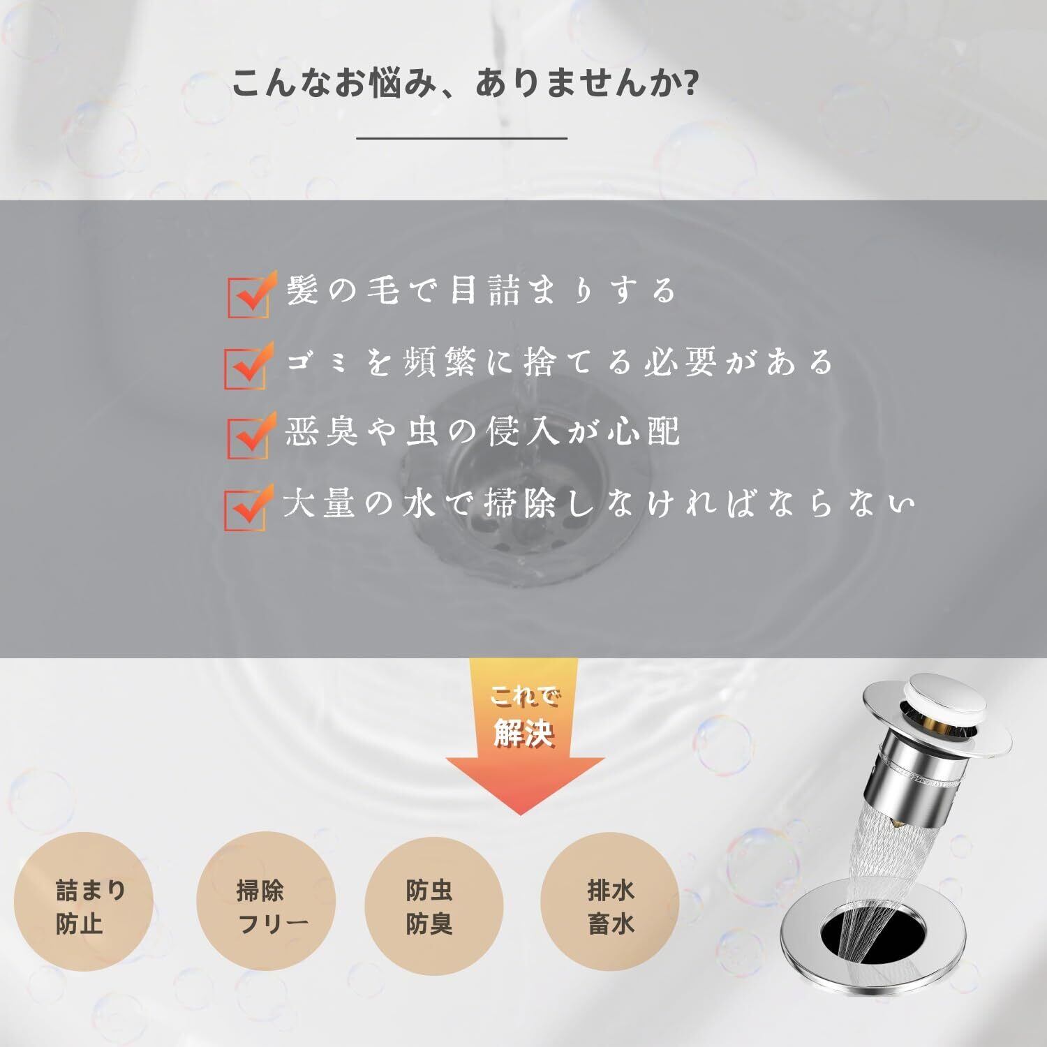 【洗面台排水口のお悩み解決】:日常的に起こる排水口の問題、例えば(髪の毛詰まり・水垢・悪臭)などでお困りではありませんか?この商品がそれらのお悩みをまとめて解消します!洗面台 ヘアキャッチャーは取り外し可能で、髪の毛、指輪などの小物が排水管に入るのをしっかりキャッチ。さらに、水を流していない時は底部のバルブが自動で閉まるので、悪臭の逆流や虫の侵入を確実にブロック!