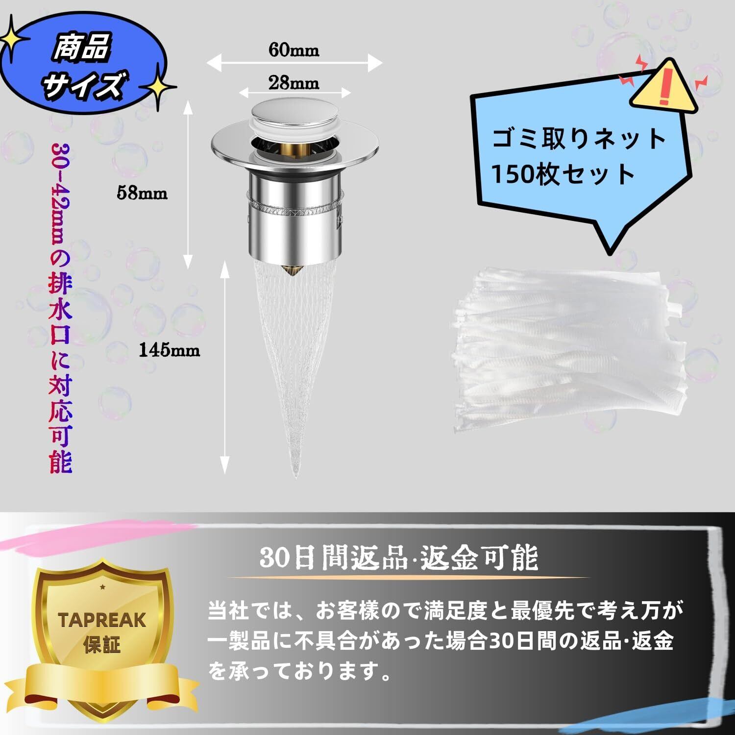 TAPREAK 洗面台 ヘアキャッチャー 排水口 ゴミ受け 洗面所ポップアップ 排水栓 30~42mm対応 【簡単に脱着できる排水口ネットホルダー 】150枚 水切りネット付き ステンレス製