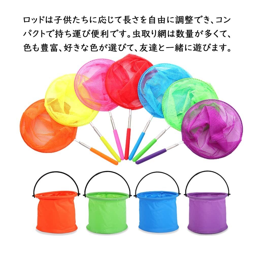 ロッドは子供たちに応じて長さを自由に調整でき、コンパクトで持ち運び便利です。虫取り網は数量が多くて、色も豊富、好きな色が選びて、友達と一緒に遊びます。振り回したり、まわりの人に当たらないように注意して使用してください 。