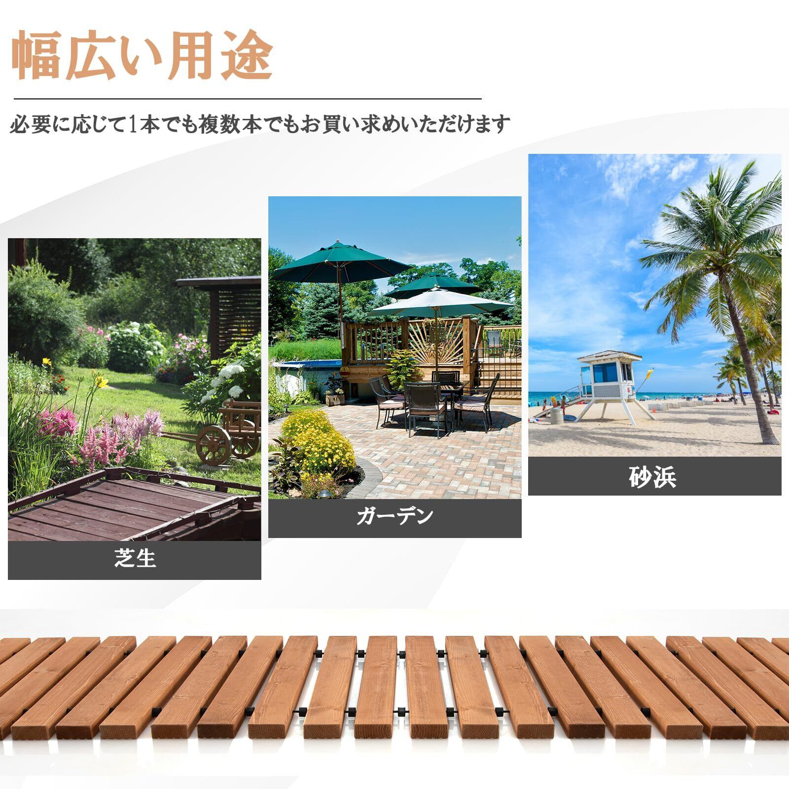 【多様な実用性】42枚の木製スラットが、砂浜や芝生、ちょっとした土の小道など、様々な地形にフィット。雨上がりでも、足元を清潔に保ち、泥はねを気にせずお庭を楽しめます。ガーデンパーティー、結婚式の会場装飾、キャンプサイトなど、様々なシーンの演出と実用性を兼ね備えています。