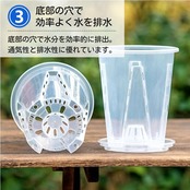 スリット鉢の特徴として、通気性の良い設計が根の発育を助けます。土の乾燥具合を適切に保てるため、根腐れのリスクを減らし、健康的な植物の成長をサポートします。透明鉢で土壌の状態も一目瞭然で、正確なお手入れが可能です。