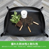 【製品仕様】:植物の植え替えや肥料作りといったガーデニング作業を行う際に周りを汚さないようにするガーデニングシートです。植え替え作業に十分なスペースを確保できる100×100cmの大型サイズで、のびのび作業ができます。両面防水性なので汚れをサッと洗い流せ、お手入れも簡単です。机の上や室内、ベランダなどに敷けば汚すことなく植物のお手入れができます。