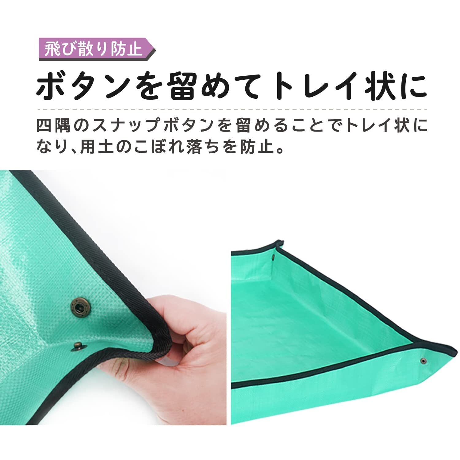 ●四隅のスナップボタンを留めることでトレイ状になり、用土のこぼれ落ちや、飛び散りを防止。