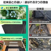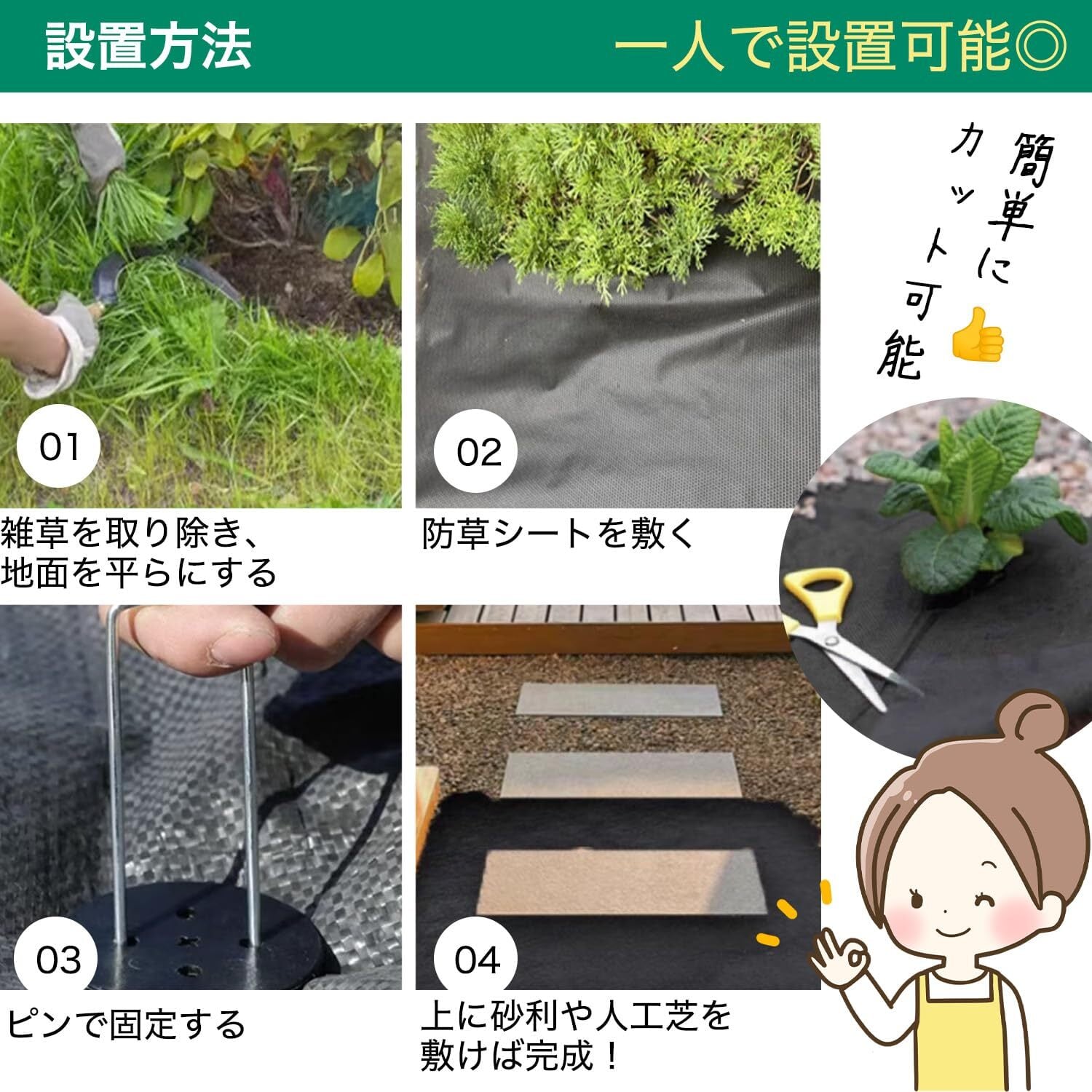 【セット内容・使用場所も豊富】 材質:高密度不織布(両面使用可) 付属品:スチール製Uピン+黒丸、説明書、ピックフックx1 ※ピンは亜鉛メッキ加工済みで、錆びにくく耐久性も抜群です。 使用場所例:路肩、畑、菜園、果樹園、花壇、空き地、建物周辺(庭、通路、物干し場、ウッドデッキ下、人工芝の下、砂利の下、ガレージ、墓地など)幅広い場所で活用できます。
