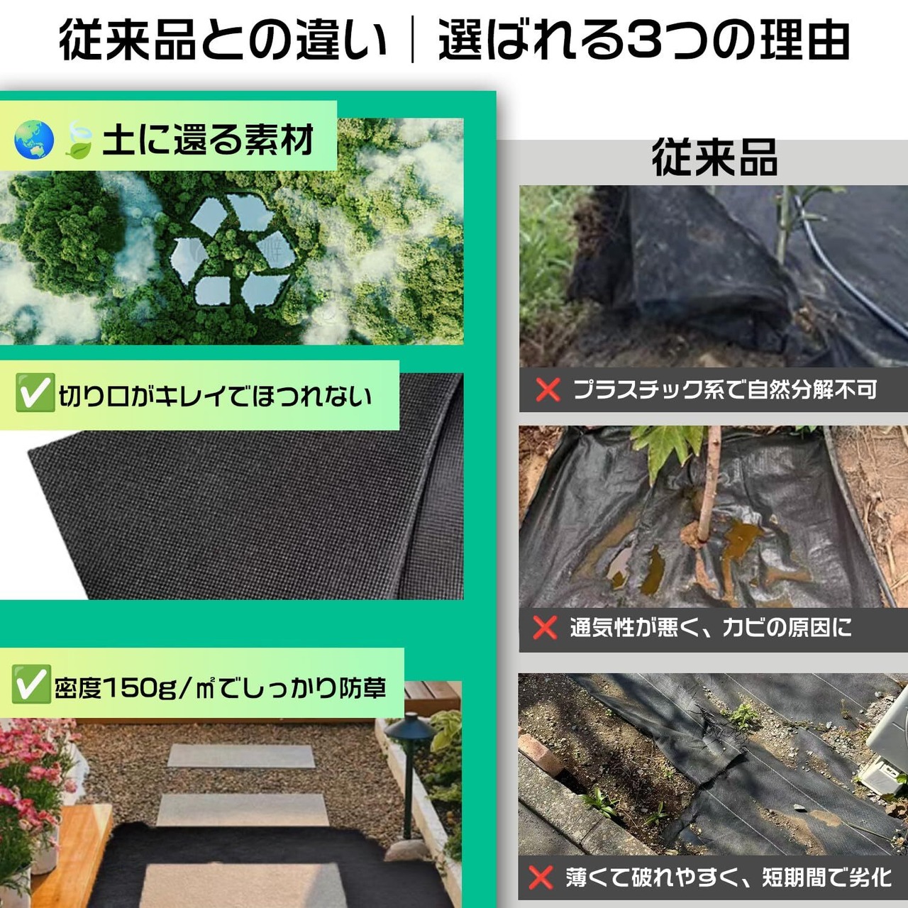 【除草剤不要・環境にやさしい・簡単カット】 除草剤を使わずに雑草の繁殖を抑えられるため、ペットのいるご家庭や家庭菜園にも安心。生分解性の不織布素材を使用しており、使用後は土に還り、環境にもやさしい仕様です。カッターやハサミで簡単にカットでき、カット面がほつれにくく、美しく仕上がります。DIYが苦手な方でも扱いやすいのが特長です。