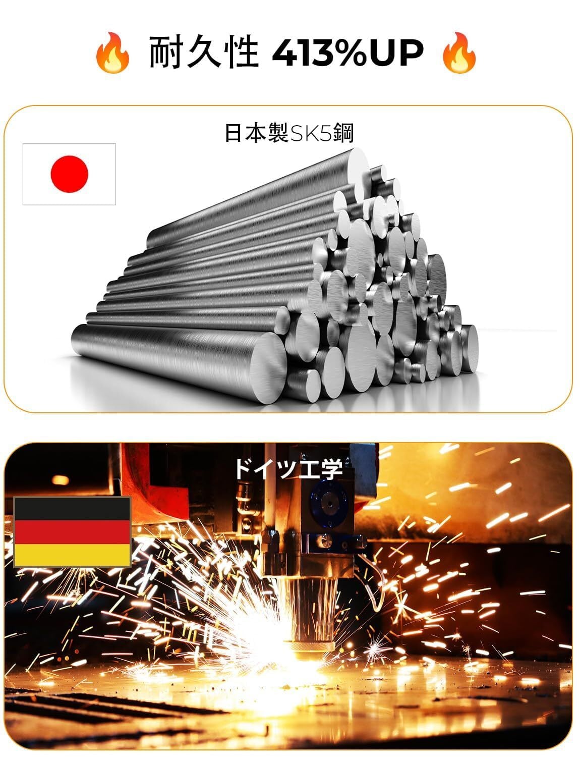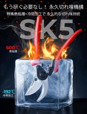 SK5高炭素鋼を使用した刃は、耐久性が5倍。鋭い切れ味で、数多くの剪定作業をこなせる力強さを兼ね備えています。錆びにくい特性もあり、長期間にわたって安心して使用できるのが大きな魅力です。