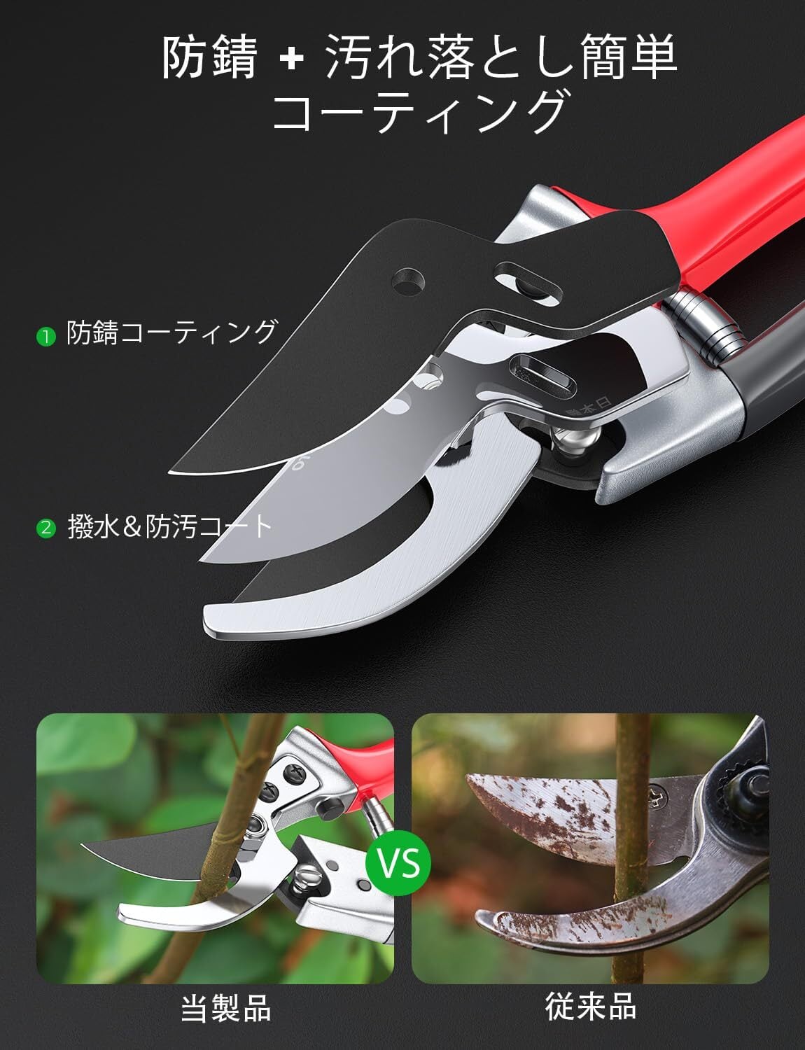 【錆びにくくお手入れ簡単】刃は防錆&非粘着コーティングのダブル仕上げで、樹液や汚れが付きにくく、作業後の掃除も簡単。剪定鋏・えだきりばさみとして屋外作業が多くても、湿気の多い季節でも錆びにくく、長期間清潔に保てるため、長く使いたい方に最適。