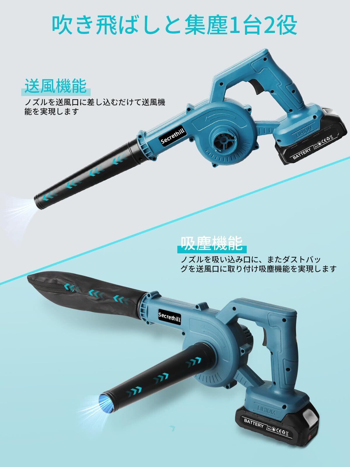 洗車 ブロワー 強力 ブロアー 充電式 残量表示 PSE認定 コードレス ブロワ 2000mAh大容量バッテリー2個搭載 マキタ18Vバッテリー対応可能 エアブロー 小型 軽量 送風と集塵1台2役 庭掃除 落ち葉掃除機 日本語取扱説明書付き(ブルー)
