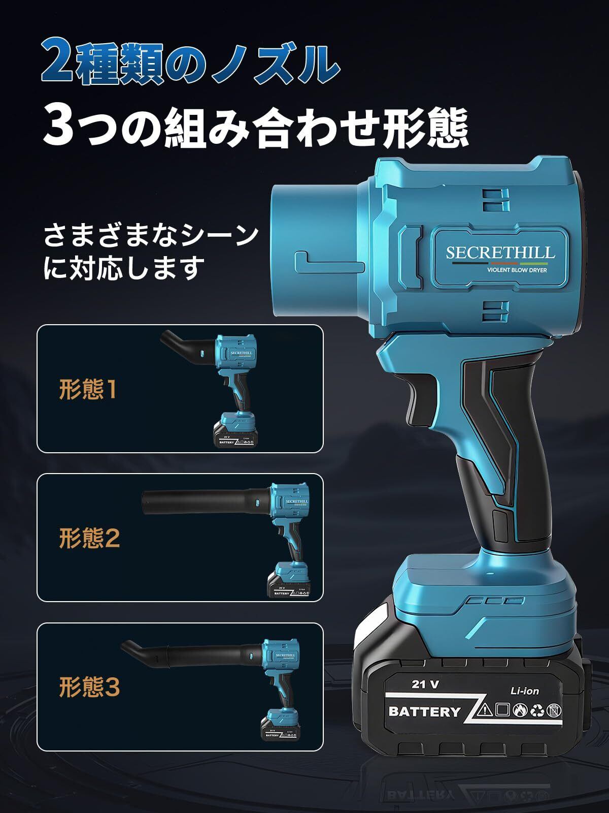 洗車 ブロワー 強力 ブロアー 充電式 残量表示 PSE認定 コードレス ブロワ 3000mAh大容量バッテリー2個搭載 マキタ18Vバッテリー対応可能 2種類のノズル付き エアーブロアー 高速回転 無段階変速 小型 軽量 耐久性 庭掃除/落ち葉/洗車/キーボード/パソコン/エアコン/網戸/除雪/バーベキュー 日本語取扱説明書付き(ブルー)