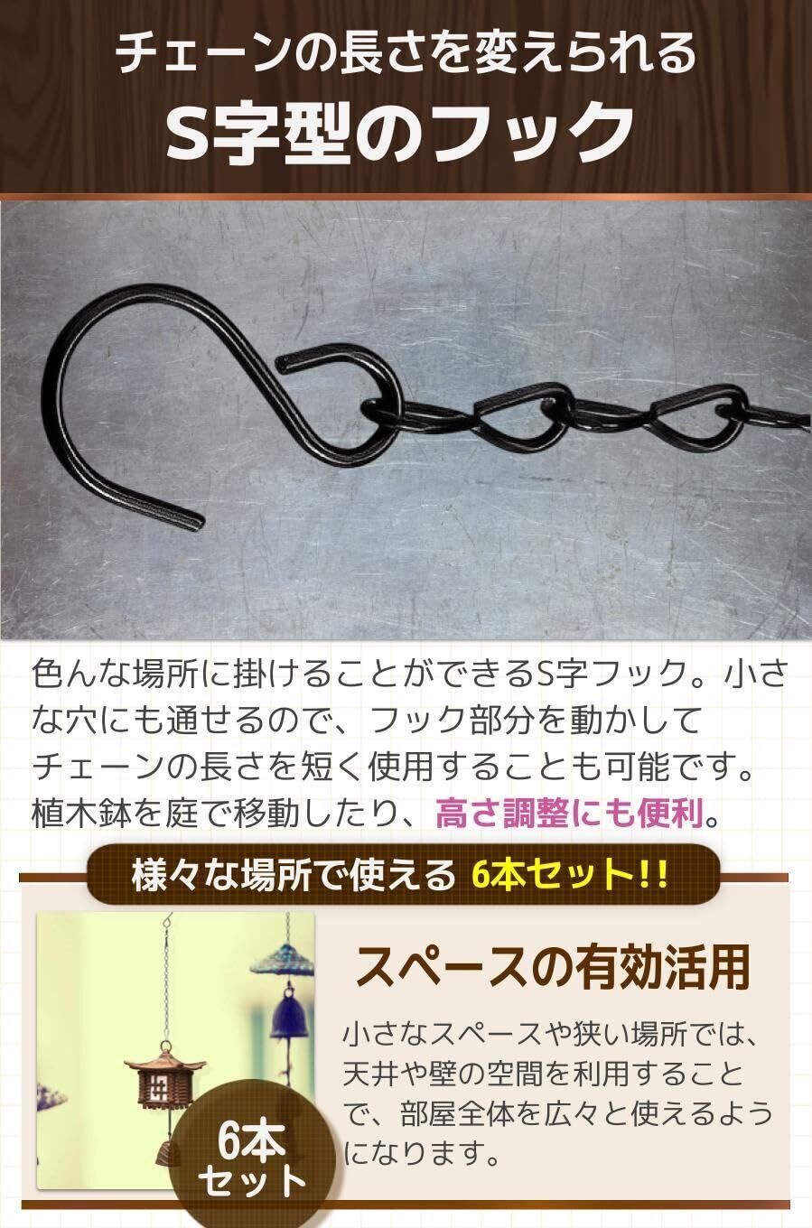 【S字型のフック】色んな場所に掛けることができるS字フック。小さな穴にも通せるので、フック部分を動かしてチェーンの長さを短く使用することも可能です。植木鉢を庭で移動したり、高さ調整にも便利。
