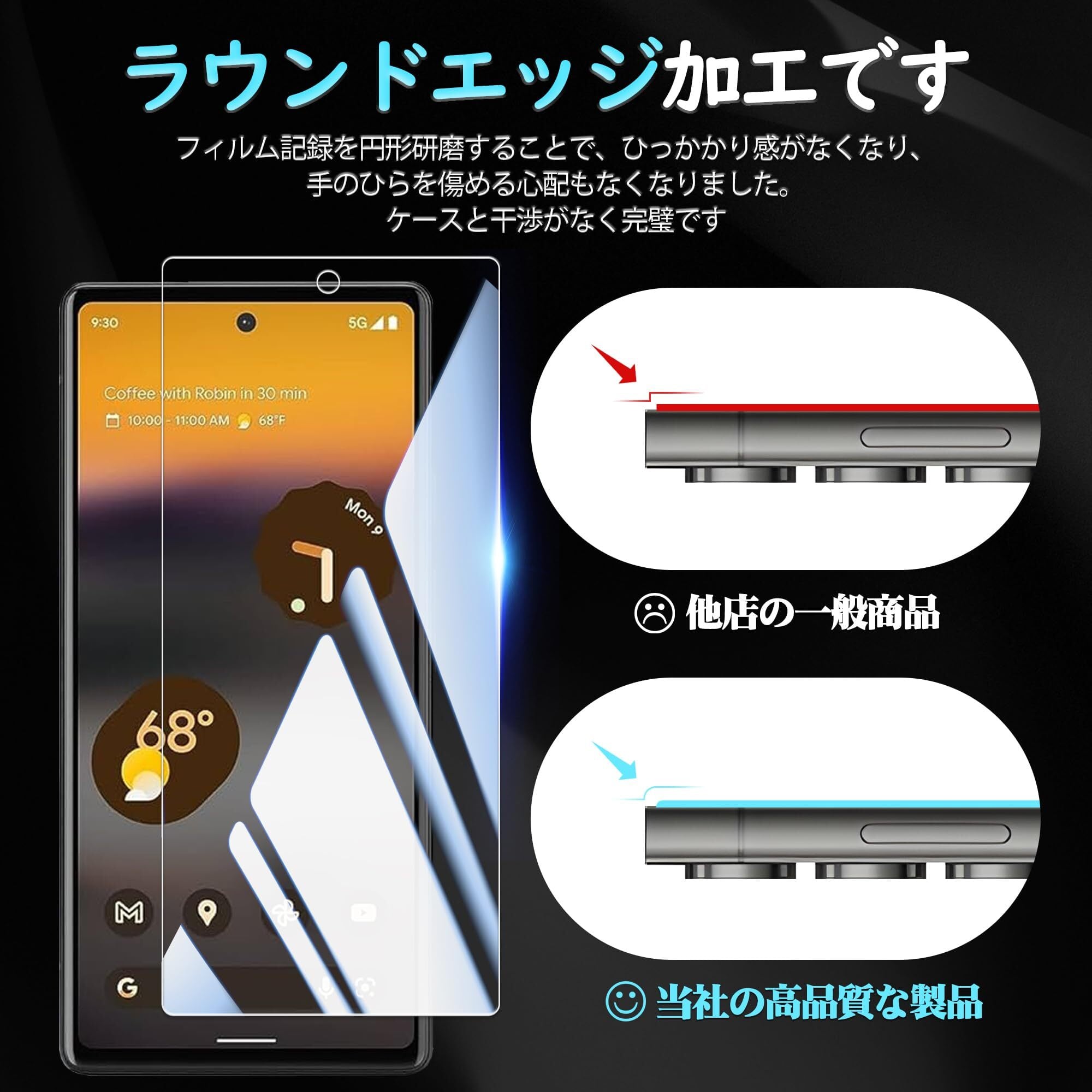 【対応機種】Google Pixel 6a ガラスフィルム2枚 + カメラフィルム2枚。【注意】この電話の画面の端は湾曲しているため、保護フィルムのサイズが丁度良い場合、しっかりと貼り付けられず、白いエッジやシェルとの干渉などの問題があるため、保護フィルムは画面よりも小さいです。